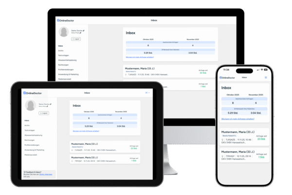 Sie möchten wissen, wie OnlineDoctor als Tool aussieht und welche Funktionen es gibt? Dann fordern Sie jetzt einfach eine Produktdemo an und erhalten Sie diese direkt per Mail.